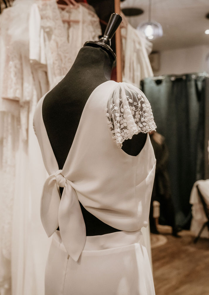 Top en crèpe grainé avec manches courtes en tulle brodé, dos noué, et jupe en crèpe grainé