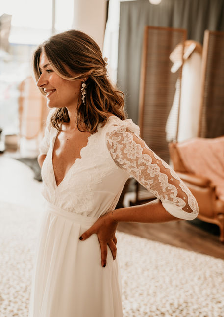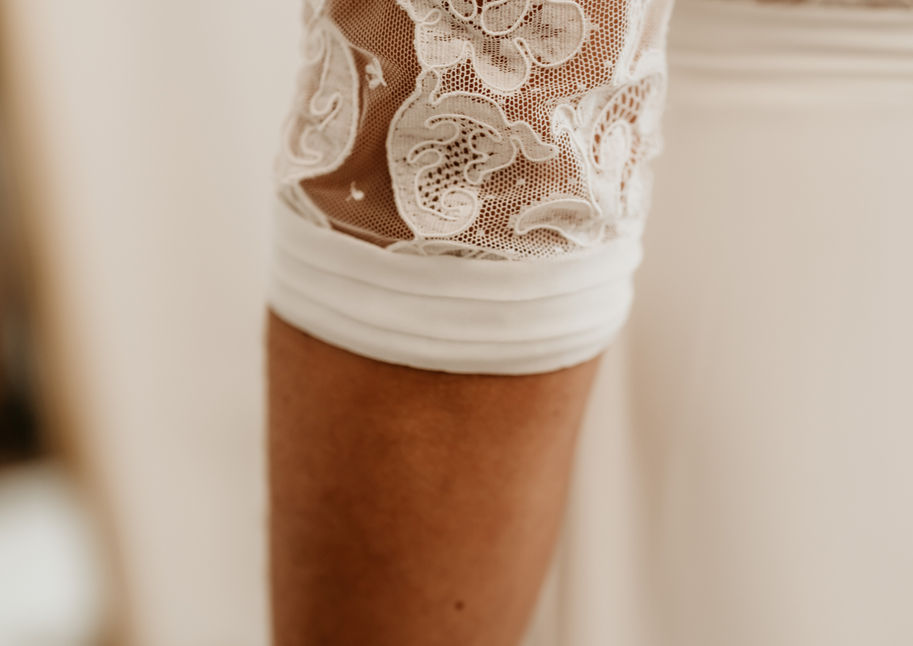 Robe en dentelle de Lyon entièrement rebrodée à la main avec un décolleté profond complété par des croisillons de mousseline, un détail signature de notre maison !