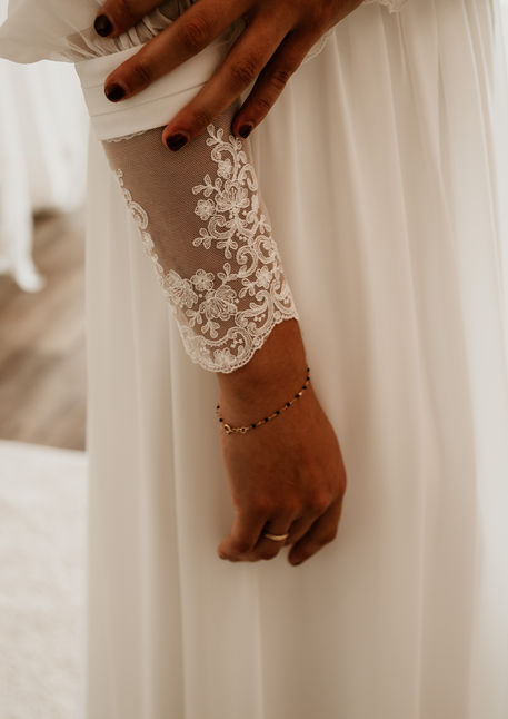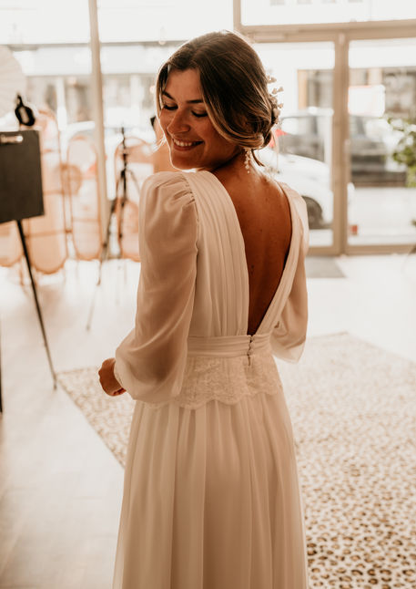 Des détails de dentelle et des plis religieuses soulignent cette silhouette à l'allure définitvement romantique