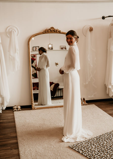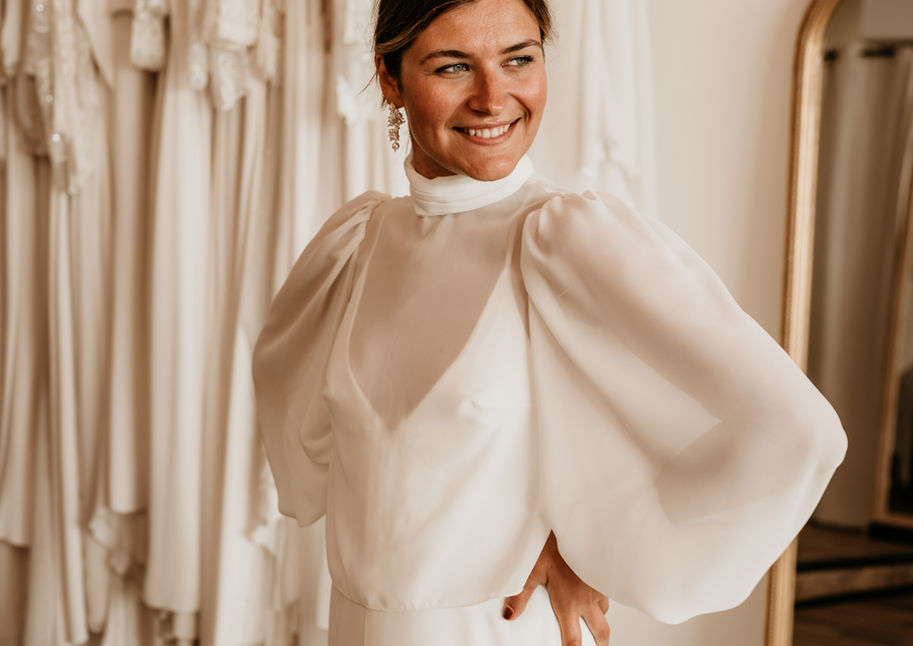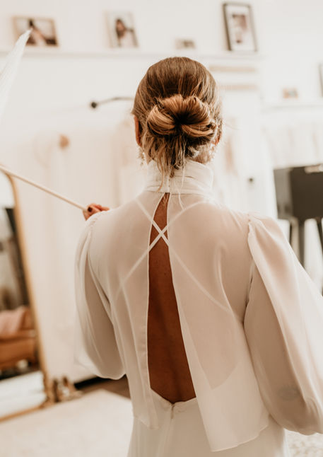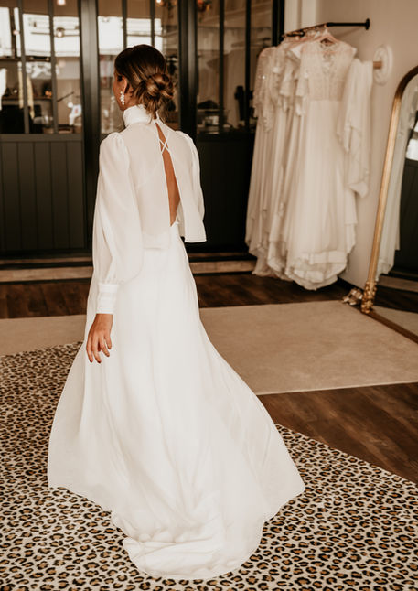 Robe de mariée à l'esprit slipdress avec détails façon bijou aux décoletés entièrement en crèpe et mousseline avec fines bretelles croisées au dos !